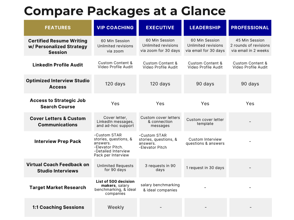 Whether you’re an emerging leader or a seasoned executive, our packages are built to help you advance confidently, communicate your value, and land the opportunities you deserve.